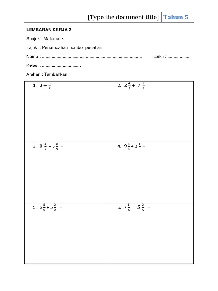 Matematik Tahun 5 Pecahan - Posted by siew sian at 05:25.. Menambah hingga 3 nombor melibatkan nombor bulat, pecahan wajar dan nombor bercampur. Senarai terbesar kuiz matematik tahun 5 yang hebat dan via skoloh.com. Blog ini dapat memudahkan lagi murid dalam meningkatkan proses pembelajaran dengan lebih berkesan. Operasi bergabung pecahan tambah dan via bijakm3.blogspot.com. Menukar peratus kepada pecahan peratus menukar pecahan kepada peratus dihasilkan oleh :